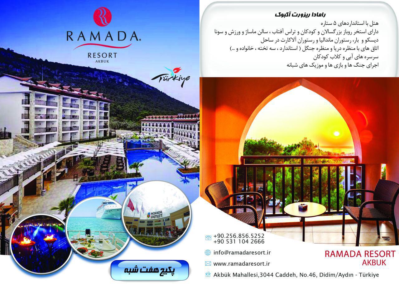 کلاب های تفریحی و شبانه در ساحل منطقه دیدیم کلاب های تفریحی و شبانه با پلاژ خصوصی ، یکی از پر مخاطب ترین و بهترین مکان های تفریحی با موزیک زنده و اجرای خوانندگان مشهور ترک زبان و لاتین وهمچنین سرو غذا های بین المللی ونوشیدنی های متنوع پذیرای مهمانان هتل رامادا ریزورت می باشند. ... گشت کشتی گشتی بر روی دریای اژه از بهترین قسمت های تعطیلات در هتل رامادا ریزوزت آکبوک تور یک روزه گشت در دریای آبی با پرچم ابی ازه به همراه سرو ناهار و نوشیدیی بر روی اسکله کشتی با اجرای موزیک و بازدید از جزیره های اطراف می باشد. ... دهکده باستانی شیرینجه دهکده حضرت مریم دهکده شیرینجه یکی از بهترین مناطق باستانی منطقه دیدیم می باشد که مشهور است به تهیه عرقیجات و نوشیدنی های متنوع و تست رایگان نوشیدنی ها و همچنین طبیعت بکر و ساختار پلکانی روستا یاداور منطقه ماسوله ایران است . یکی دیگر از جاذبه های گردشگری این منطقه تهیه قهوه ترک بر روی شن داغ می باشد که تجریه آن پیشنهاد میگردد. بازار دهکده شیرینجه مملو از صنایع دستی باب میل گردشگران و نوشیدنی های تهیه شده از انواع میوه جات و... می باشد ... مرکز خرید سوکه نوادا مرکز خریدی که اکثر برند های مطرح در آن دارای شعبه می باشند. این مرکز خرید دارای سالن سینما با اکران فیلم های روز دنیا و سالن سر باز کنسرت می باشد . در محوطه باز این مرکز خرید انواع رستوران و کافه ها وجود دارد که لذت خرید و تفریح و تست غذاهای نو را در یک روز به همراه دارد . فاصله این مرکز خرید از هتل حدود ۳۰ دقیقه است. این تور یکی از پر بازدید کننده ترین تورهای این مجموعه می باشد که زمان آن در اختیار گردشگران است شام بیاد ماندنی در رستوران ساحلی آلاکارت هدیه بیاد ماندنی هتل رامادا ریزورت به گردشگران ایرانی